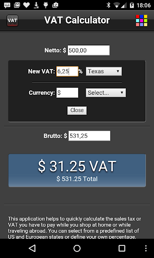 This application helps to quickly calculate the sales tax or VAT you have to pay while you shop at home or while traveling abroad. You can select from a predefined list of US and European states or define your own percentage.