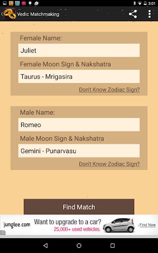 After starting the Vedic Matchmaking application, you will see a screen where the inputs need to be added for male and female, such as Name and Birth Star. Those who are not aware of the birth star can click on the link “Don’t know your Zodiac sign”. This will take you to a new screen where you have to enter the Birth details.