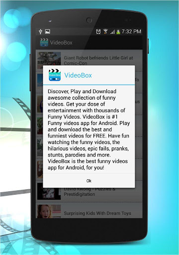 Get your dose of entertainment with the best Funny Videos collection. Video Box is #1 Funny videos app for Android. Play and Download the best and funniest videos every day, whenever you want to entertain yourself. VideoBox videos download feature allows you to download mp4 clips and watch them later or share the movies on Facebook or the other social media. Get the best Funny Videos app from Google Play now! Have fun watching the funny videos. Do you search for funny videos, hilarious videos, funny clips, funny movie clips, epic fails, pranks, stunts, parodies and more? Video Box - Funny Videos app is for you! Video Box is the best funny videos app for Android, waiting for you! Share your favorite funny videos application via text, email, Facebook, Twitter and more.