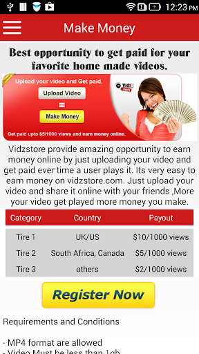 Requirements and Conditions : MP4 format are allowed,Video Must be less than 1gb, No Spamming or illegal files allowed.One view per IP will be paid Upload videos and share on social pages