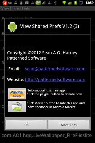 Using a rooted phone with the super user app, you only have to confirm root access a single time, then you can browse the Shared Preferences as much as you want. The main screen lists all installed packages that have a shared preferences directory. After choosing a package to view, you are presented with a list of all of that packages SharedPreferences XML files. Next you may select one of these XML files to view its contents. Hit the back button at any time to return to the previous screen.