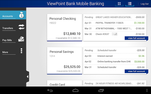 ViewPoint Bank’s Mobile Banking App makes it easy for you to bank on the go. Do your banking right from your Android! You can manage your accounts, pay bills, find ATMs and more! Bank with confidence – ViewPoint Bank’s Mobile App allows you to manage accounts from your mobile device...anytime, anywhere. Now it’s easy to do banking 24/7, right from your Android. It’s fast, secure and free. With ViewPoint Bank Mobile Banking, you can: • Check available balances & transaction history. • Pay bills and credit cards. • Transfer money between ViewPoint Bank accounts. • View and activate your cash back offers • Find the nearest ViewPoint Bank branches and ATMs. • Send us a message. To use ViewPoint Bank Mobile Banking, you must be a ViewPoint Bank customer and enrolled in our online banking service. To sign up, visit www.viewpointbank.com