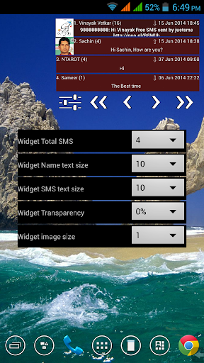 widget will show first (latest) sms of each thread with sender, time, sms and contact image (if available).