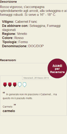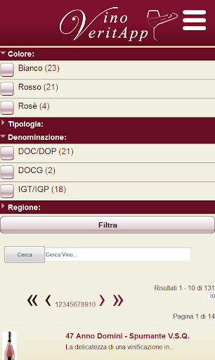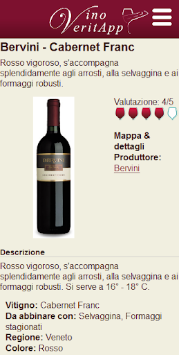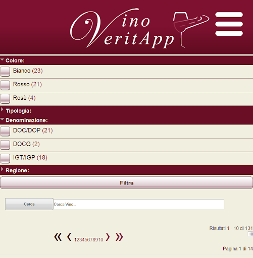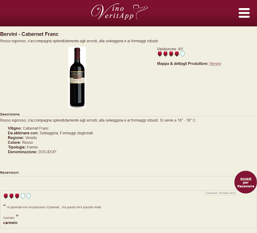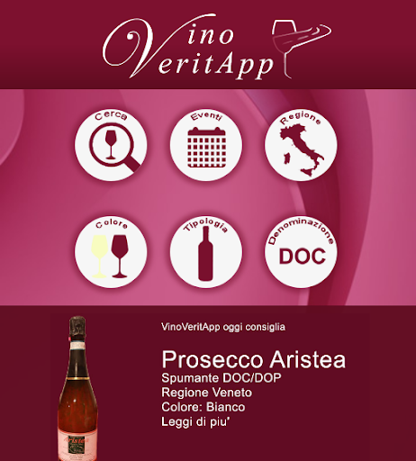 Grazie a Vino VeritApp non e' mai stato cosi' facile trovare i migliori vini sul territorio Italiano. Cerca in base a vari criteri di ricerca (nome, colore, tipo, regione...), guarda la scheda tecnica, leggi i commenti degli altri utenti e commenta a tua volta. Da Oggi puoi trovare nella sezione "Eventi", le maniestazioni, degustazioni nei locali piu' vicini a casa tua e tutto cio' che riguarda il mondo del vino.