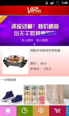 VIP专享区,每天十点,几十款Vip专享宝贝同时开抢,一分钟售馨,手快有,手慢无 。亲买的不只是商品,是心跳!