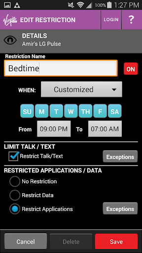 Seeking more control over the spending and usage from those who are on your multi-line plan? Get them Virgin Mobile Custom smartphones, and then use this app on your Android device as a remote control. You can instantly do it all – add more talk, text and data; set usage limits; determine curfews for phone usage by time and day; manage who can contact the devices; control which apps can be used and much more, all from your Android device.