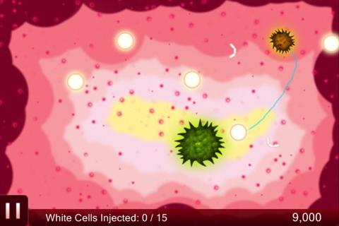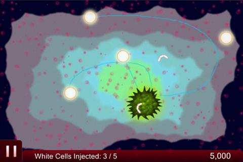 Hold you finger over the white blood cell and the destination virus will blink. Drag your finger to create a path for cell to follow, picking up RNA strands on the way! Be careful not to allow the cells to touch each other; they will explode!