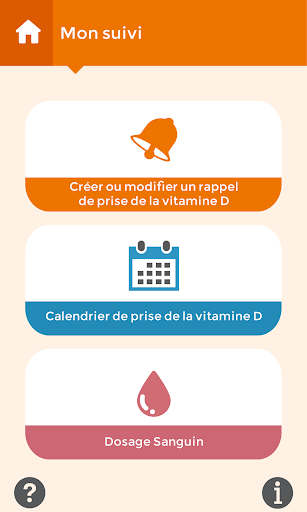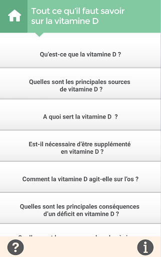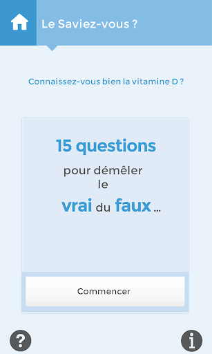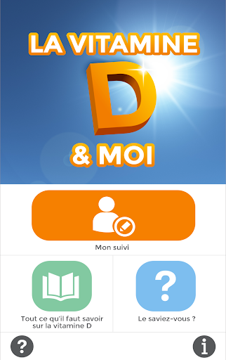 L’application « LA VITAMINE D & MOI » fournit des informations globales sur la vitamine D ainsi qu’un QCM et permet de faire un suivi de ses prises. Ne fournit pas, de quelque manière que ce soit, des conseils en matière de santé.