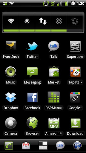 A sleek glass-like theme for CM7 and T-Mobile Theme Engine supported ROMs. Glass icons and green accents throughout make this theme stand out.