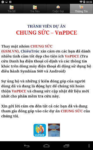 * VnPDCE là phần mềm chạy trên thiết bị di động dùng để tra cứu thông tin danh bạ điện thoại, tự động hiển thị thông tin số điện thoại gọi đến, gọi đi, lịch sử các cuộc gọi, tra ngược từ tên thuê bao hoặc địa chỉ thuê bao để tìm số điện thoại liên quan ... kèm theo các tiện ích tra cứu: Từ điển đa ngôn ngữ, Tử vi Vạn Phước, Thông tin doanh nghiệp, Mã vùng trong nước, Mã vùng quốc tế, Đầu số CMND, Mã số thuế, Mã bảng số xe VN, Địa chỉ đặt máy ATM VN, List KaraOke vi tính, Tuyến xe búyt ...