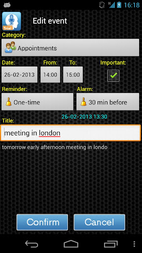 All these features will be available in an easy and quick way. Vocal Memory can also automatically identify all time references, so you won't waste time by manually setting the day and time of your event, it would be enough say it out loud and as naturally as you can. Then, leave it to Vocal Memory, which will enter the event in the right place for you. When you want retrieve all the event related information, you must not do anything else but asking.