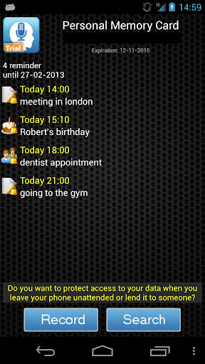 Vocal Memory expands your memory capacity. It is like having a "second mind" at your fingertips, always ready to remind you of your appointments, tasks, anniversaries and deadlines or to take note of all your incomes and expenses. No more worries about following a specific syntactic scheme to enter your events. This app is able to understand your words, store them in your reserved personal area and remind you of them at the right time. You can enter any kind of information, not only appointments or deadlines, but also simple notes.