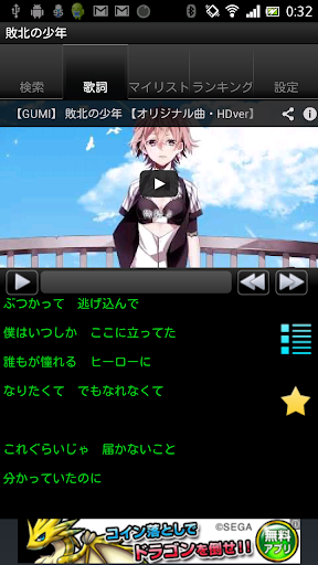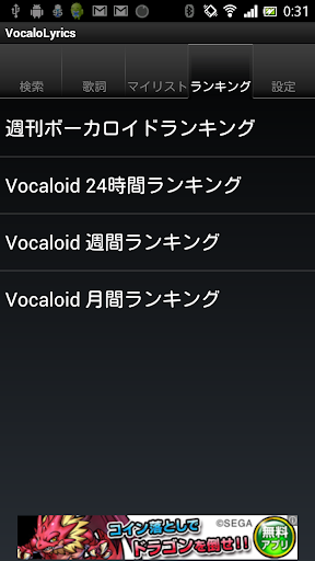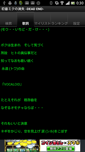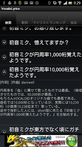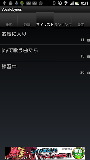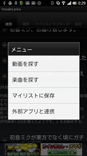 曲を聴きながら、VocaloLyricsで歌詞を楽しみましょう! [お知らせ] ※ 楽曲、CD情報は定期的に更新しています。 ※ このアプリでは直接曲を再生することはできませんが、他のプレイヤーで再生中の曲情報を取得して歌詞表示が出来ます。 ※ wikiに掲載されているのに出てこない曲が有りましたらご連絡下さい。 ※ 初音ミクwiki、UTAU楽曲データベースに掲載されていない曲は検索出来ません。 ※ 検索ができなくなった場合は、メールまたはtwitterでお知らせ頂けると幸いです! [機能一覧] * 曲名の一部を入力することで、曲名検索ができます。 * 歌詞の一部を入力することで、歌詞から曲名を検索できます。 * 作詞者、作曲者から楽曲検索できます。 * カラオケの機種(JOYSOUND, DAM, UGA)に登録されている楽曲を検索できます。 * Vocaloid、UTAUの種類を指定して曲名を検索できます。 * ボーカロイドのCDを検索できます。 * マイリストに好きな曲を登録できます。 (マイリストに保存した曲の情報はオフラインでも表示できます)。 * 作ったマイリストは、他のボカロユーザーに公開することができます。 * 各種ランキングを閲覧できます。 * 曲情報を外部アプリに送ることができます。Twitterとの連携に! * プレイヤーで再生中のボーカロイド楽曲の歌詞をリアルタイムに表示することができます。 (初回起動時は、音楽情報を取得する為に一度プレイヤーで音楽を再生しなおしてください) ・対応プレイヤー - MixZing - WinAMP - PowerAMP (Freeのみ確認) - PlayerPro - Android標準プレイヤー - Xperia acro (IS11S) 標準プレイヤー [マイリストバックアップ(引き継ぎ)機能の使い方] これは別端末へマイリストを引き継ぐ際に使います。端末を買い換えた時などに! → (1) 引き継ぎたいマイリストを長押しして、「サーバへバックアップする」項目を選択して下さい。 → (2) バックアップに成功したらパスコードが表示されますので、メモします。 → (3) 別端末において、マイリストページで「Menulキー→「バックアップを受信する」を選択して下さい。 → (4) 2で取得したパスコードを入力して下さい。 ※ この機能は、ネット環境の安定している場所で使用して下さい。 ●Twitter : http://twitter.com/afezeria_at よろしくお願いします。 ---- 【更新履歴】 動作しなくなった場合はお手数ですが、レポート、またはメールをお願い致します。 1.13.1 (2015/04/05) * YouTubeのv2 APIが廃止になることに伴う、v3 API対応を行いました。 1.13.0 (2015/02/22) !!!初回起動時にマイリストデータの再構成を行いますので、終了までお待ちください!!! * お使いのAndroid OSバージョンに合わせたUIテーマを使うようにしました * マイリストの楽曲を並べ替えられるように変更しました * マイリストの楽曲数が多い場合に開けないバグを修正しました * 歌詞検索結果のUIを変更しました * その他細かいバグの修正 1.12.3 * 動画と歌詞検索で、YouTube動画が見れるように修正しました。 1.12.2 * ニコニコ動画リンクを、デフォルトでスマートフォンサイトに変更しました。 * ライブラリの関係で、Android2.3以上対象のアプリとなりました。 1.12.1 * 検索対象に、「UTAU」を追加致しました。 * niconico動画の動画がない際に、「動画を探す」を選ぶと落ちるバグを修正しました。 1.12.0 * CD検索機能を追加しました → ミクwikiのデータを元にしておりますので、ミクwikiにない場合は検索できません(- -; * 楽曲検索のボカロ種類一覧を、会社ごとに分けました 1.10.1 * ご報告頂いた問題に対応しました。 => タブ切り替え時に落ちる問題に対処しています。 1.10.0 * UIを、タブベースに変更しました。 1.9.2(2012/09/11) * 「マイリストに保存」 と 「マイリストから削除」 の文字が逆になっていた点を修正しました。 → 更新点はこれだけです!すみません! 1.9.1(2012/09/09) * ランキング動画一覧から、直接にこさうんどにとべるようにしました。 * 楽曲を探す先から、にこみみを消去しました(サイトが無くなったため)。 * マイリストに登録している楽曲データを、更新できるようにしました。 (マイリストの曲データと検索結果のデータが違う際にお使い下さい) → マイリストの楽曲を長押し → 「曲データを更新する」をタップ。 1.9.0(2012/08/26) * ランキング機能を追加しました ※ Thanks to ぼからん(週刊VOCALOIDランキング)! → 「歌詞と動画を検索する」から、Youtube動画と歌詞を同時に見ることができます。 これにはFlashPlayerがインストールされている必要があります。 → 「歌詞と動画を検索する」は、動画をDLしますので、Wifi環境で使用して下さい。 * 曲名判別を強化しました → ランキング、楽曲連動でより正確にタイトルを抽出します。 * 一部の画面を縦固定にしました。 ---- 【Special Thanx】 - 初音ミクWiki ボーカロイド楽曲の総合サイトです。 こちらのデータを取得させて頂いております。 - モアイ部 カイトアイコンを使わせて頂きました! http://www.geocities.jp/moaibu0/ ---- ●キーワード 初音ミク 鏡音リン 鏡音レン 巡音ルカ KAITO MEIKO CUL SeeU IA 結月ゆかり Me