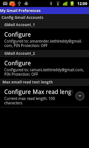 Voice Read My Gmails app voice reads your to top 10 gmails from inbox of configured gmail account securely. Very easy, intuitive user interface will enhance the user experience. While it is voice reading gmails,it also displays the content of the gmail on the screen. You can configure multiple (two) gmail accounts within the same app. Optionally you can PIN protect accessing your accounts.It has features to "pause, play, prev,next,start,end" buttons for easy navigation similar to media player style. The also detects the deals/commercials type of emails from most of the companies and skips (ads skipping) them.