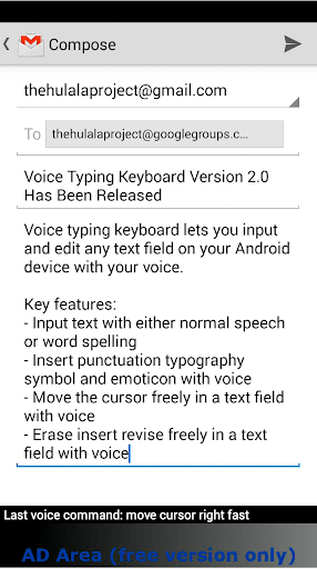Voice Typing Keyboard (VTK) lets you input and edit any text field on your Android device with your voice. No microphone button to push, simply say "Listen" and start to speak what you would like to input in a text field.