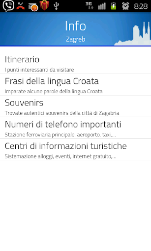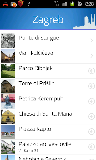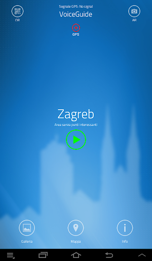 Benvenuti nell'audioguida di Zagabria. In seguito vi daremo un po' di informazioni su come usarla. L'applicazione è supportata da un sistema GPS che consente al turista di seguire gli itinerari con le principali attrazioni turistiche. Entrando in una zona di particolare interesse della città, l'applicazione si attiverà automaticamente e potrete accedere a tutte le informazioni riguardanti i monumenti più vicini. Basta avvicinarsi ad un'attrazione e subito vi saranno presentate le notizie più interessanti relative ad essa.