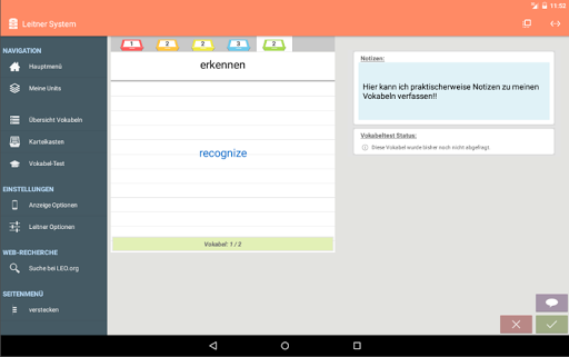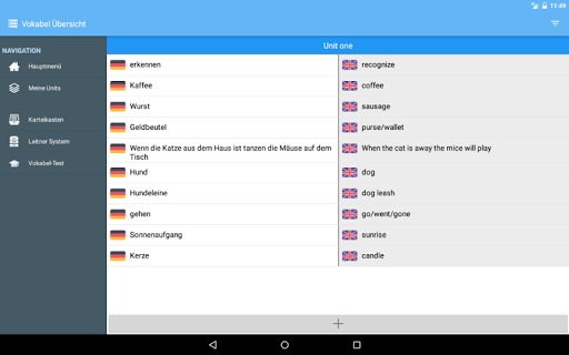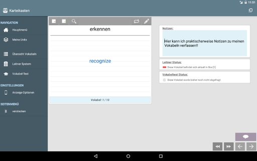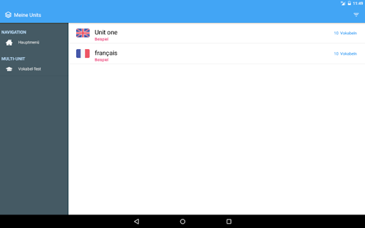 Mit unserer App hast du einen kompletten Karteikasten für deine persönlichen Vokabeln und vieles mehr immer griffbereit auf deinem Smartphone oder Tablet. Du brauchst niemanden mehr der deine Vokabeln abfragt. Vokabeltrainer Pro ist immer verfügbar (solange dein Akku geladen ist :-) )