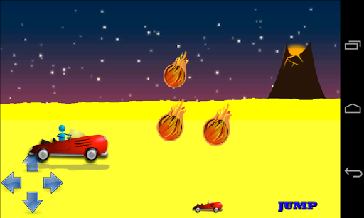 The volcano is about to blow. Start the car and get out of there. Avoid the fireballs flying towards you as well as the smaller ones in the road. You car is fitted with a handy JUMP button which will help.