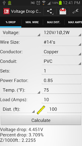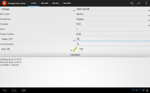 This app will calc the voltage and % dropped and give you the impedance of the wire based on the inputted values.