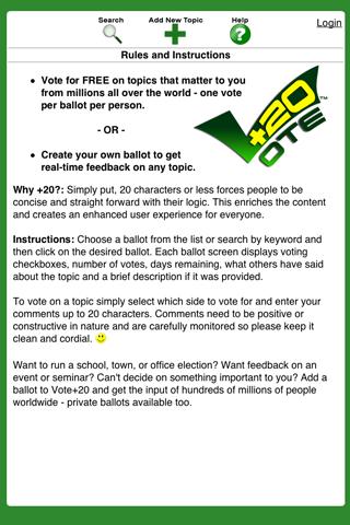 Want to run a school, town, or office election? Want feedback on an event or seminar? Can't decide on something important to you? Add a ballot to Vote+20 and get the input of hundreds of millions of people worldwide - private ballots available too.