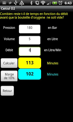 Permet de calculer le temps restant dans les bouteilles d'oxygènes en fonction du débit , du volume de la bouteille et de la pression. Très utile pendant les transferts