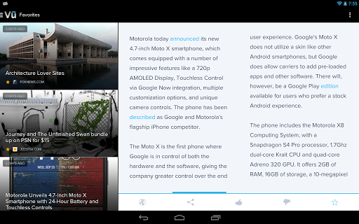 Vū 提供精美的介面來瀏覽你所關注的資訊。Vū 會從網路上搜集資訊並送到您的手上, 會通過互動來了解您的閱讀喜好。無論您是在線或離線,Vū 都能送上您感興趣的文章。