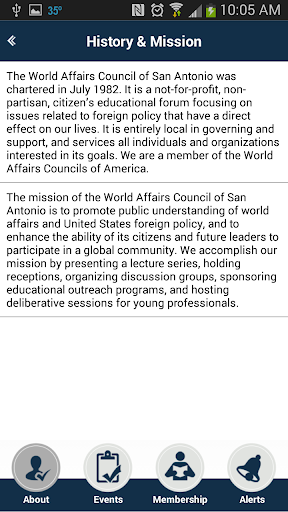 WACOFSA application provides an engaging communication tool for World Affairs Council of San Antonio to communicate information about the organization. The app provides information about the History & Mission, Board of Trustees, Executive Committee, Social Links, Events, Membership Information and Push Notification Alert functionality.