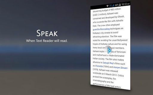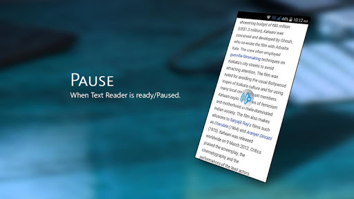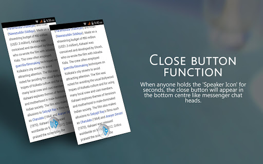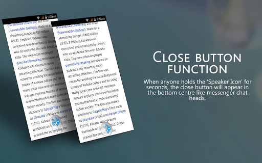 => Move the pop up button like Facebook chat head. Place the button anywhere you like and start reading text by tapping onto it. Drag it anywhere when the reader read the text or pause it when you don’t. Hide the popup button by dragging it to bottom of the screen just like Facebook chat head.