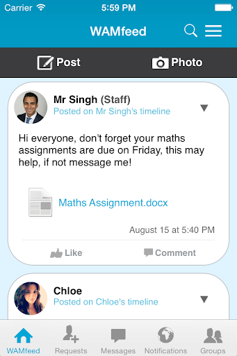 WHY? Those in charge and those being taught use different communication channels outside of the classroom to deliver and share content; teachers rely on text/email, but students use tools like Snapchat/WhatsApp. So the two don’t meet. Emails get ignored or deleted, social media gets read and used! Traditional social networks (Twitter/Facebook etc) are NOT the answer. They blur the lines between social and school life creating real integrity issues (no parent wants to see their child “like” a bikini shot of a teacher on holiday) with no audit trail or safeguarding. WAMedu is a controlled, secure environment, which still engages the students (with it's social network look and feel) but also protects teacher's professional integrity.