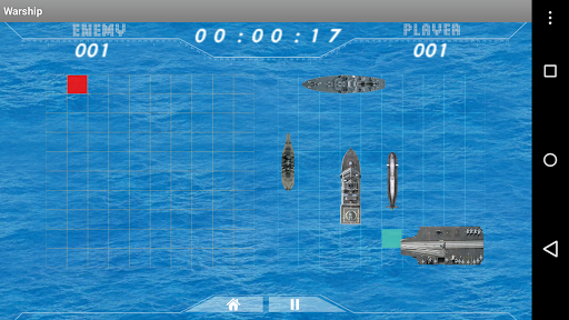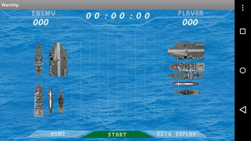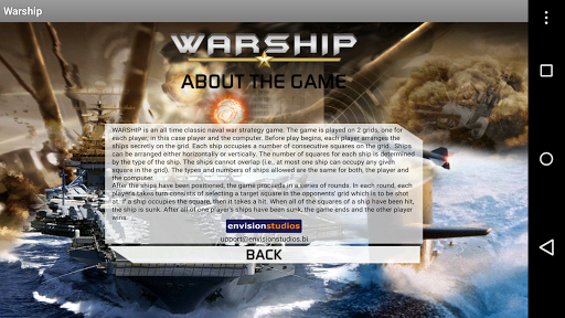 WARSHIP is an all time classic naval war game. WARSHIP for Android is played between the user and the computer. The game is played on 2 grids, one for each player; in this case player and the computer. Before play begins, each player arranges the ships secretly on the grid. Each ship occupies a number of consecutive squares on the grid. Ships can be arranged either horizontally or vertically. The number of squares for each ship is determined by the type of the ship. The ships cannot overlap (i.e., at most one ship can occupy any given square in the grid). The types and numbers of ships allowed are the same for both, the player and the computer. After the ships have been positioned, the game proceeds in a series of rounds. In each round, each player's takes turn consists of selecting a target square in the opponents' grid which is to be shot at. If a ship occupies the square, then it takes a hit. When all of the squares of a ship have been hit, the ship is sunk. After all of one player's ships have been sunk, the game ends and the other player wins.