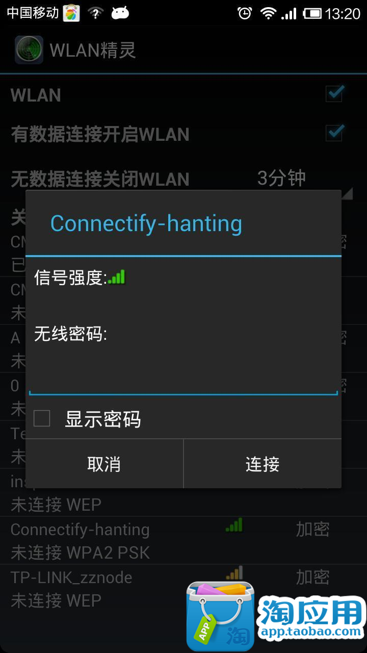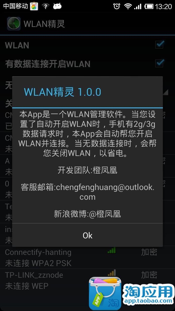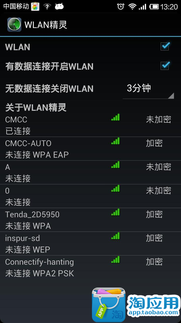 本应用是一个WLAN自动管理免费软件。当用户在使用手机上网时,本应用会自动开启WLAN,并进行连接。如果附件没有可用的WLAN信号,会自动关闭WLAN。当用户不再上网时,会帮用户自动关闭WLAN,以节省电力。