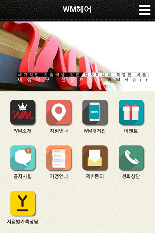 WM헤어의 VIP회원들을 위한 앱이며 각지점 소개 및 다양한 이벤트,할인,미용정보,공동구매,제휴업체할인 등