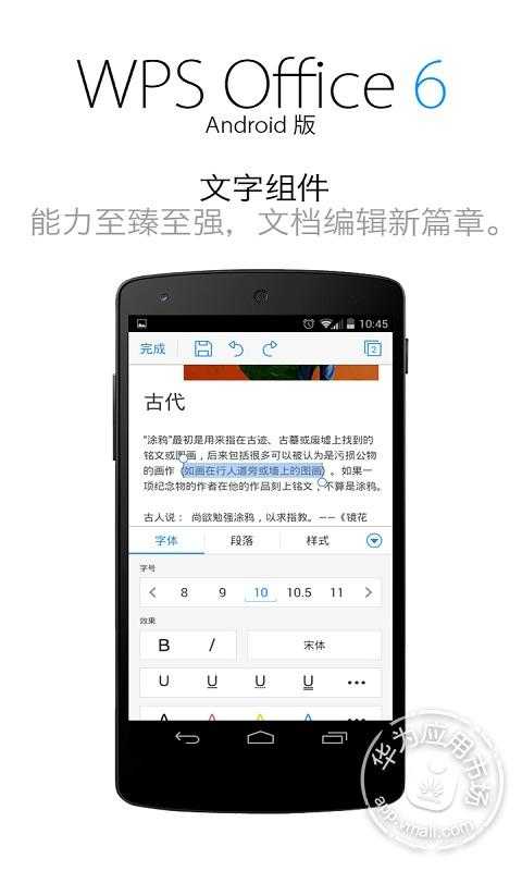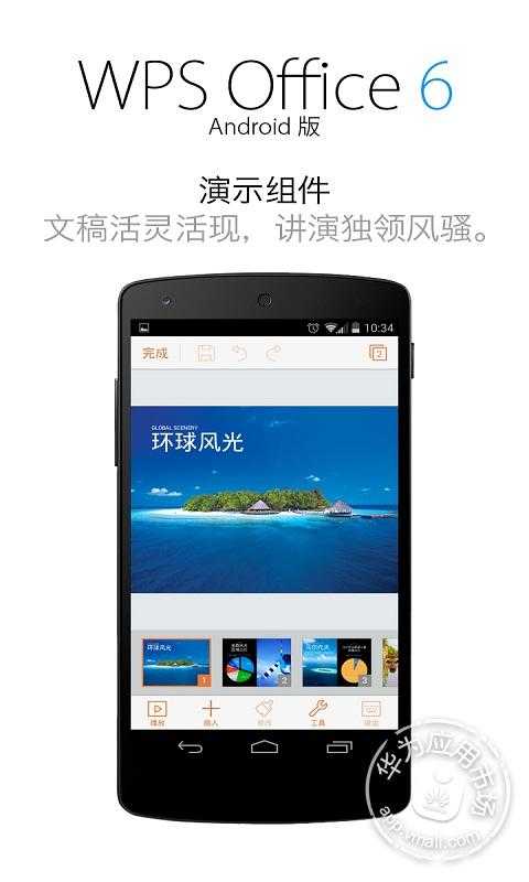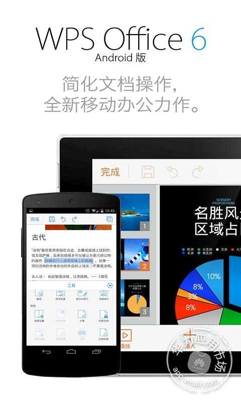 最佳安卓办公软件,个人版永久免费,体积小、速度快;独有手机阅读模式,字体清晰翻页流畅;完美支持微软Office、PDF等23种文档格式;文档漫游功能,让你离开电脑一样办公。