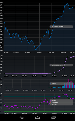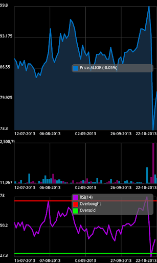Selecting a stock from the list of shares, user goes to the history module where the history of price change and its RSI indicator are presented. The application allows to check the history in various intervals. Additionally, you can use a Pinch-Zoom method which is very helpful in a non-standard intervals.