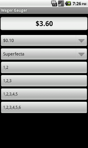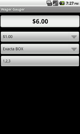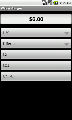 Wager Gauger is a bet calculator. It calculates the cost of exotic bets (Exacta, Trifecta, Superfecta, HI-5) or multi-race bets (Daily Double, Pick 3, Pick 4, Pick 5, Pick 6). Choose the cost of the bet, the type of bet, and your selections. You can box it or choose your selections in each leg.