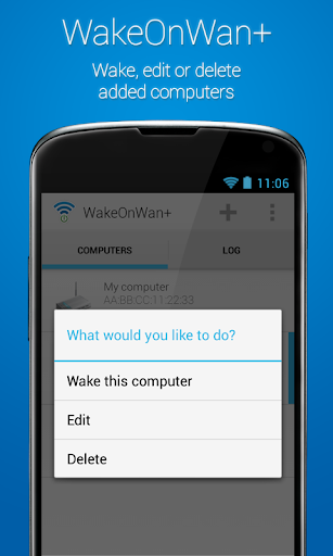 Using the WakeOnWan+ android app it's easy to turn on or wake a computer. With a simple action you'll be able to wake your computer through Wake-on-LAN. With the handy (optional) "auto-wake" functionality computers will wake automatically as soon as your phone or tablet connects to a (previously specified) wireless network (SSID).