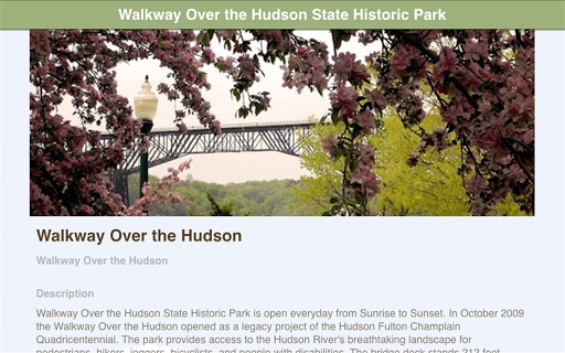 Helpful app that brings together information, pictures and much more about the Walkway Over The Hudson State Historic Park. The Walkway website, Facebook page, Instagram, Twitter are easily accessed through one simple interface. Find your way to the Walkway from your current location or get directions to multiple parks and historic sites in the Poughkeepsie and Highland/New Paltz areas.