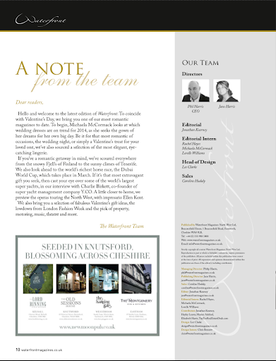Waterfront…. An exclusive lifestyle magazine based in affluent North West England. Waterfront features the very finest designer fashion, reviews uber luxury hotels and restaurants, interviews with high profile businesses and celebrities, guides to the best high society events and much more.