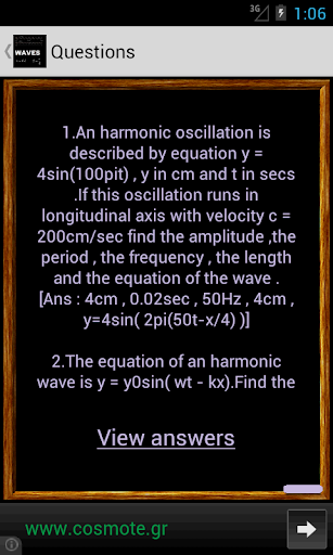 Waves covers the Physics field Waves . Theory of Waves is covered in a single chapter(Wikipedia article) . The user then before going to handle exercises is given some questions of understanding . The style of these questions require a deep knowledge of these meanings . Exercises are organised in different chapters as to cover special cases as standing waves. Users with an intermediate background can immediately go to exercises . This app displays full screen ads