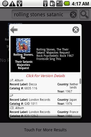Want to know if that record you just found is a first release? With Wax you can search for detailed information on vinyl records and CD;s from the Discogs database. Information includes release dates, catalog numbers, album credits, format (i.e. Record, CD,Tape, ep, lp, color vinyl....), and much more.