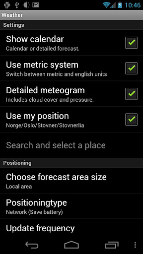 Tip: If the place you get when using "my position" is incorrect, try to search for the correct place, and choose this. When you select "use my position" the next time, it remembers this place, and uses it when you are nearby.