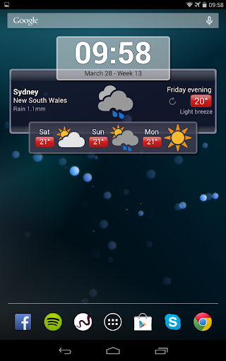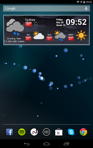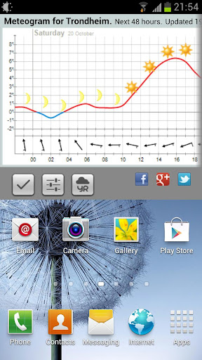 Touch the widget to show the meteogram, a detailed graphical display of the forecast for the next 2 days. Touch the update icon (2 arrows) to manually update position and forecast.