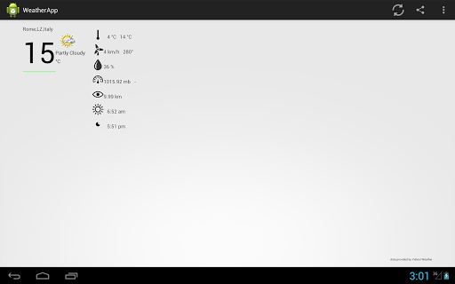 This is a demo app that shows the current weather information. The app is described in Surviving with Android blog at the link http://www.survivingwithandroid.com/2014/02/android-weather-app-tutorial-step-by.html, where you can find all the information how to code this app.