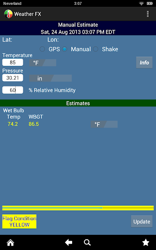 Once you accept the prompt to acquire the GPS position, the Latitude and Longitude labels will be populated. Click the “Update” button and the app will populate the temperature, pressure and humidity text fields based the closest weather station ID to your position. The app will then calculate the wet bulb and WBGT temperatures. You'll also notice that the WeatherFX app will place the location name and time of the reading at the top of the screen. This way you will know if the readings are in your location and timely.