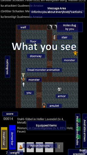 - Monsters may pick up stuff, wield weapons, wear armor. Some will follow you, some will act in teams, some will run away or mind their own business.