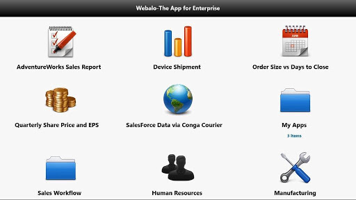 Whether your organization relies on enterprise applications from IBM, Oracle, SAP, Microsoft, Salesforce.com, other vendors, or in-house applications, Webalo provides mobile access to these applications individually or combines functionality and information from multiple applications to give mobile users access to the exact data and functions they need to whiz through tasks and workflows more productively.