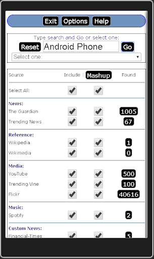 * Optionally, 'Mashup' chosen sources and view their results together, a page at a time.