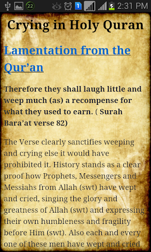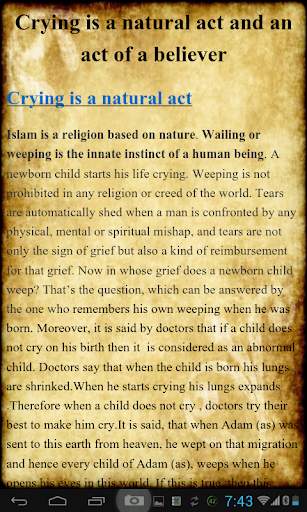 This application is aimed at highlighting the importance of crying in the light of human instinct, the verses of the Holy Qura'an, authentic traditions (ahadith) and the sunnah of the Prophet's(saw) companions (sahaba).