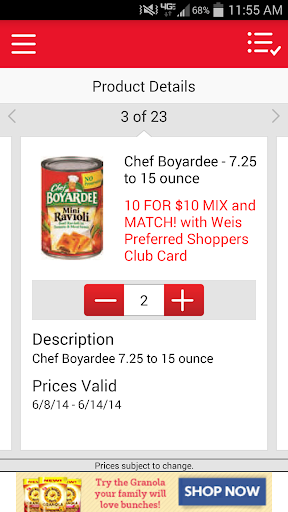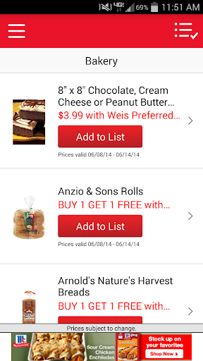 The Weis Markets App delivers Weekly Specials in real time from your home store to your fingertips. Create your grocery list wherever you are by using your Android to shop sale items from Weis Markets. Easily browse hundreds of items instantly. Your list will be neatly organized into categories with real time pictures, descriptions and prices. This application downloads the specials directly to your Android. You can even synchronize with your Weis Markets shopping list from http://www.weismarkets.com.