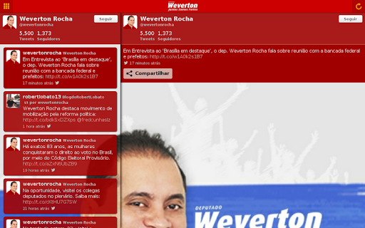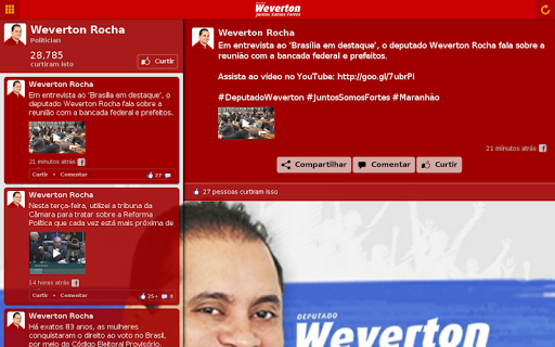 O aplicativo Weverton 1212 é um canal gratuito onde você pode acompanhar de perto e a qualquer hora o deputado federal e candidato à reeleição, Weverton Rocha. Nele você conhece a história de vida do parlamentar, acessa vídeos, jingles, Twitter, Facebook, compartilha imagens nas redes sociais, acompanha a sua agenda diária, e ainda pode entrar em contato com o candidato. Baixe o aplicativo e seja você também um 1212. Weverton Rocha #édeluta